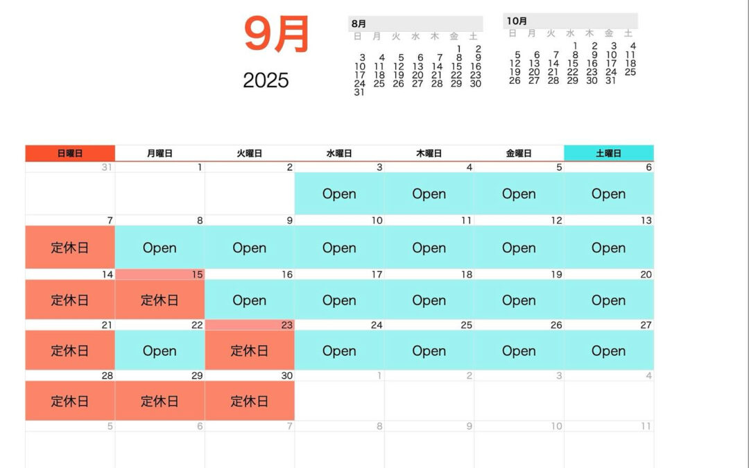 9月は日お休み、ですが祝月と29日(月)のお休みがありますのでお気をつけください。