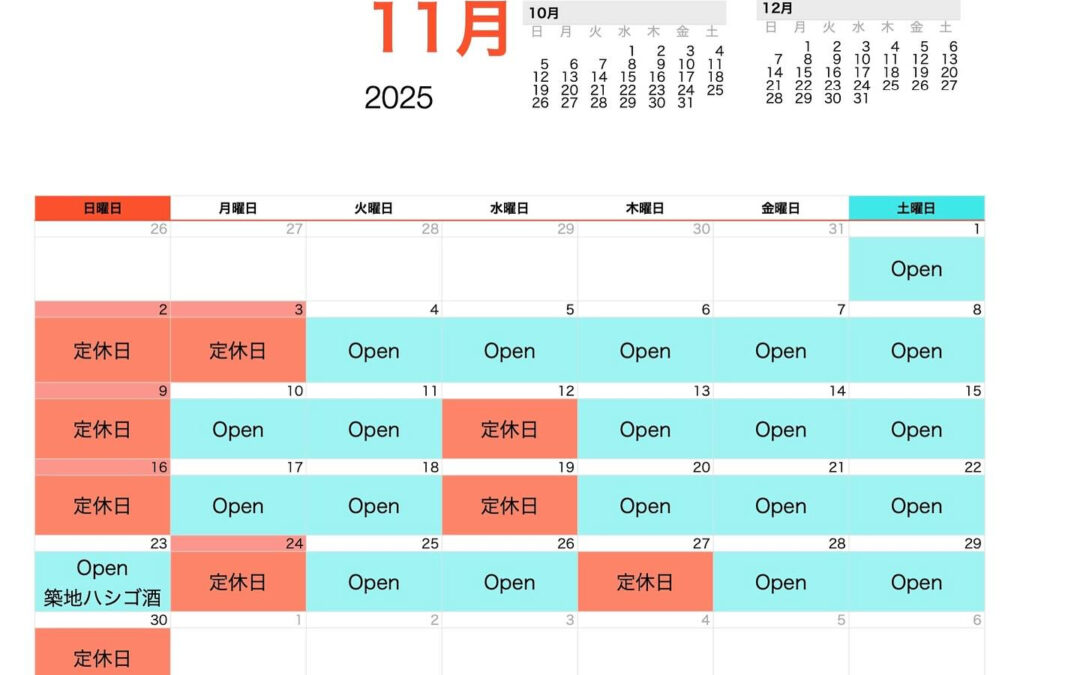 日曜、水曜日が定休ですが月末に築地はしご酒のイベントにより日曜日営業に伴い営業スケジュールが少し動いておりますのでご査収をお願い致します。